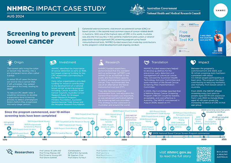 From this time onward, NHMRC provided a succession of grants related to CRC screening, including to researchers James St John, Graeme Young, Finlay Macrae and Glenn Salkeld, whose work would underpin development of what became the National Bowel Cancer Screening Program (NBCSP). Other sources of funding for their work included: Cancer Australia, State Cancer Councils, US National Institutes of Health, Australia Cancer Research fund, South Australian Strategic Health Research Program, Smith-Kline Diagnostics, Australian Gastrointestinal Trials Group, US National Cancer Institute, Flinders Foundation, Hospital Research Foundation, CSIRO, Eiken Chemical Company, Fujirebio and Enterix Australia.